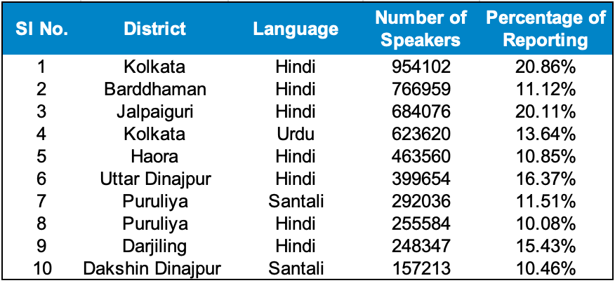 But let us look at the districts where the official languages would be amended i.e the districts where more than 10% of the population spoke one of Urdu, Hindi, Santhali, Oriya and Punjabi.