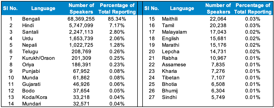 Comparing these to Nepali, we quickly come to the conclusion that Nepali was concentrated heavily towards the north. More than 59% of the district of Darjeeling spoke Nepali as a mother tongue and more than 70% of the state’s Nepali speakers resided in Darjeeling.